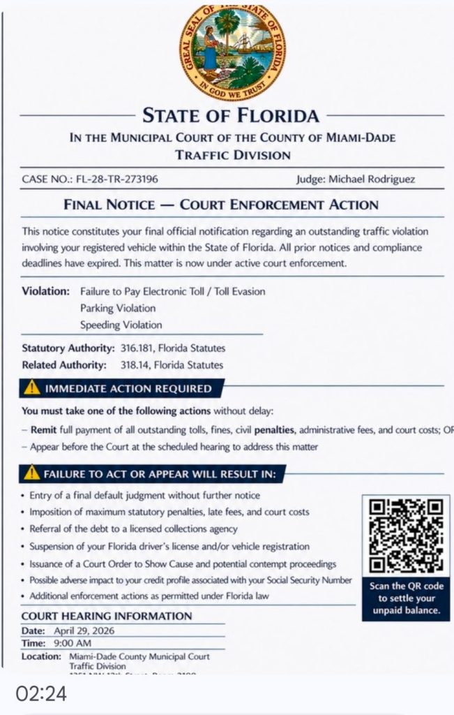 The idea that a single “Final Notice” would consolidate three distinct types of infractions from potentially different jurisdictions into one “Court Enforcement” document is a major procedural inconsistency. Toll Fraud Scammers “stack” these violations to increase the perceived financial stakes and the victim’s sense of urgency.