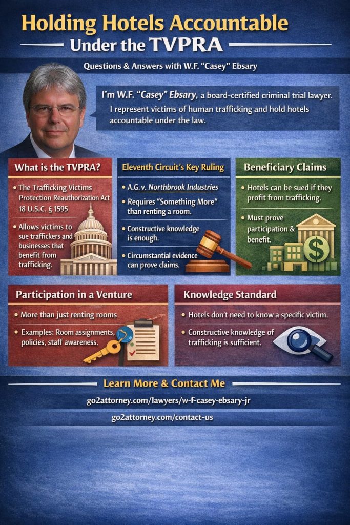 I am W.F. “Casey” Ebsary, a board-certified criminal trial lawyer. In my practice, I represent individuals and families confronting serious and complex legal issues, including cases involving human trafficking. These cases require careful legal analysis, disciplined investigation, and a willingness to take on well-funded corporate defendants. When trafficking intersects with the hospitality industry, federal law may provide a path to accountability that extends beyond the trafficker to the businesses that may have enabled or benefited from exploitation.